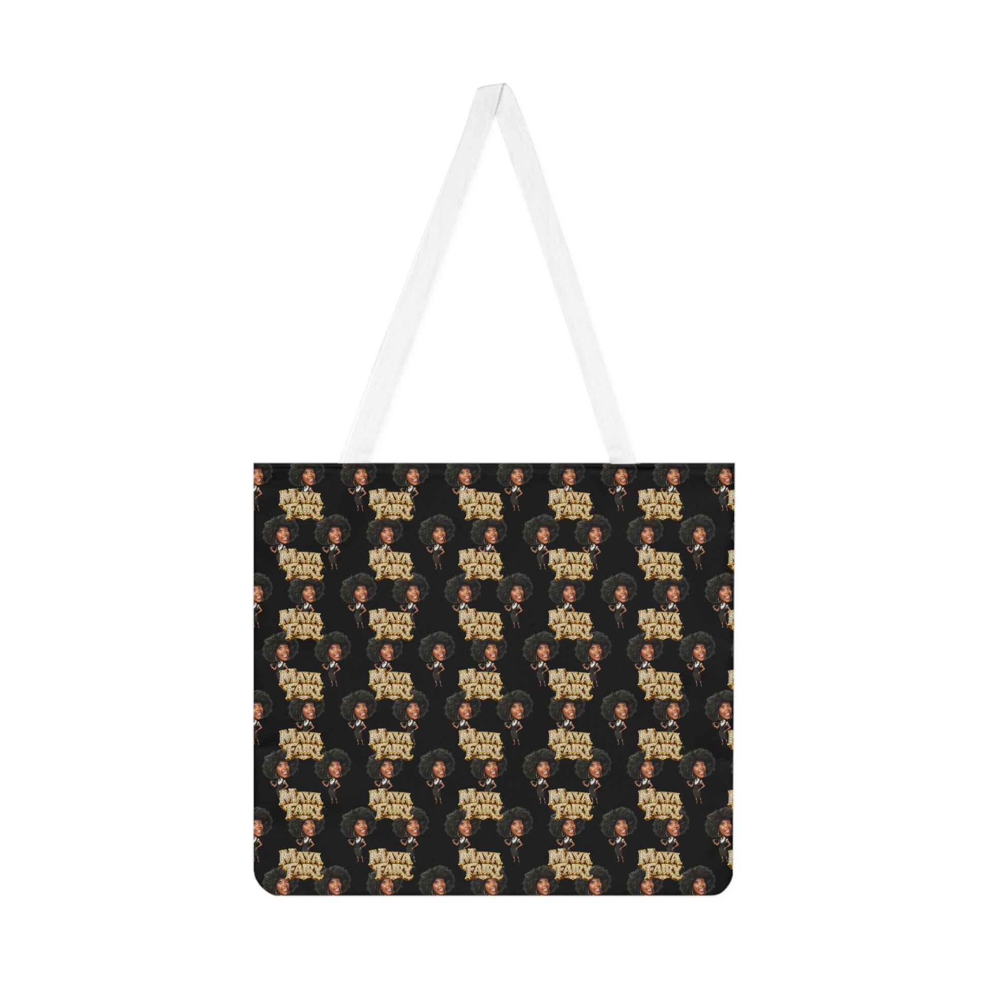 This cotton shoulder tote features an all-over Maya Fairy print that brings personality front and center. The dark background lets the artwork pop, while the soft cotton fabric keeps it lightweight and comfortable for everyday use. Long white handles sit easily on the shoulder, and reinforced stitching adds strength where it counts.